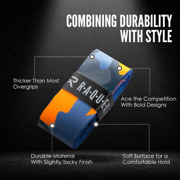 Raquex’s Evoke distinctive camouflage inspired tennis racket grip tape is the perfect choice for players who prefer a more rugged and outdoorsy look for their sports racquets, but want the grippy, reliable performance that Raquex’s overgrip tapes always serve up. The racquet over grip tape anti slip pack of three consists of the camo earthy colours such as greens, browns, greys, and oranges, as well as the stripes version using similar colours, and offers a quick and simple remedy for restoring old, worn out racket grips; the perfect badminton, squash or tennis racket overgrip tape as well as many other racket sports.