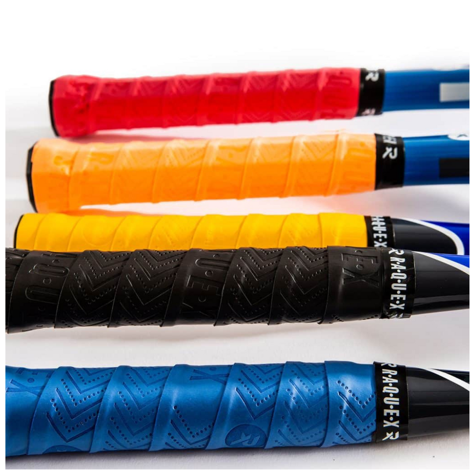 Raquex’s ‘Evolve’ anti slip overgrip tape for sports rackets is a highly absorbent and grippy over tape that provides an easy and cost-effective solution to repair old worn-out racket grips, making it the ideal squash racket overgrip, badminton racket overgrip or tennis racket overgrip tape. They’re super soft for comfort, and feature a unique arrow pattern design that helps direct sweat away from the surface to maintain a full grip. Each racket overgrip tape features an anti slip grip to deliver control, with the arrow pattern to maintain breathability that helps keep palms fresh and prevents odour. So, if you’re on the lookout for an overgrip for tennis rackets, squash or badminton rackets, Raquex overgrip tape is an economical remedy for tired and worn racket grips to get them quickly and easily restored and you back playing on the court! Our pack of five contains blue, red, yellow, orange and black colours, so you can match up with your racket or your personality.