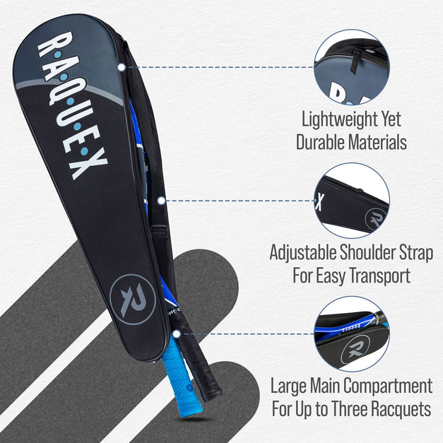 This Raquex full length racquet cover is designed in the UK for one or two racquets. The size is perfectly suited for standard sized squash or badminton racquets. The robust zip keeps your racquets in place, and high quality materials have been used throughout, to ensure you get the most life from the cover whilst also preventing any accidental damage to your racquets. The cover features an adjustable shoulder strap so you can carry the cover ‘hands free’.